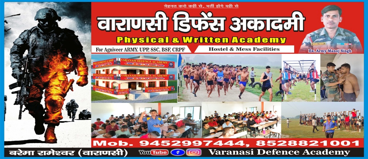 हमारे अकादमी में फिजिकल और रिटन की तैयारी कराई जाती है इस अकादमी में उत्तर प्रदेश पुलिस एस एस सी जीडी आर्मी जीडी आर्मी नर्सिंग का रिटन बैच और फिजिकल की बेहतरीन सुविधा उपलब्ध है वाराणसी में वाराणसी डिफेंस एकेडमी एक फिजिकल और रिटेन के नाम से जानी जाती है कम पैसे में अधिक से अधिक सुविधा प्रदान करती है और सफलता हर साल उत्तर प्रदेश में नंबर वन पर देती है